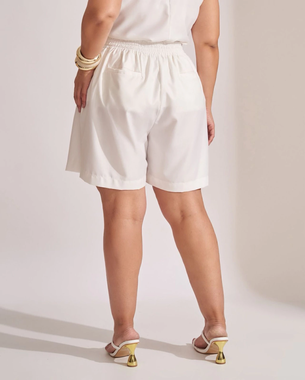 A Bermuda Collab é confeccionada em tecido de alta qualidade com 88% poliéster e 12% viscose, garantindo conforto e durabilidade. Seu design sofisticado apresenta detalhe de cós deslocado e botão forrado com acabamento dourado, além de pregas frontais que valorizam o caimento. Conta com elástico no cós traseiro e bolso em alfaiataria, ideal para quem busca estilo e praticidade. Disponível do tamanho 38 ao 54.