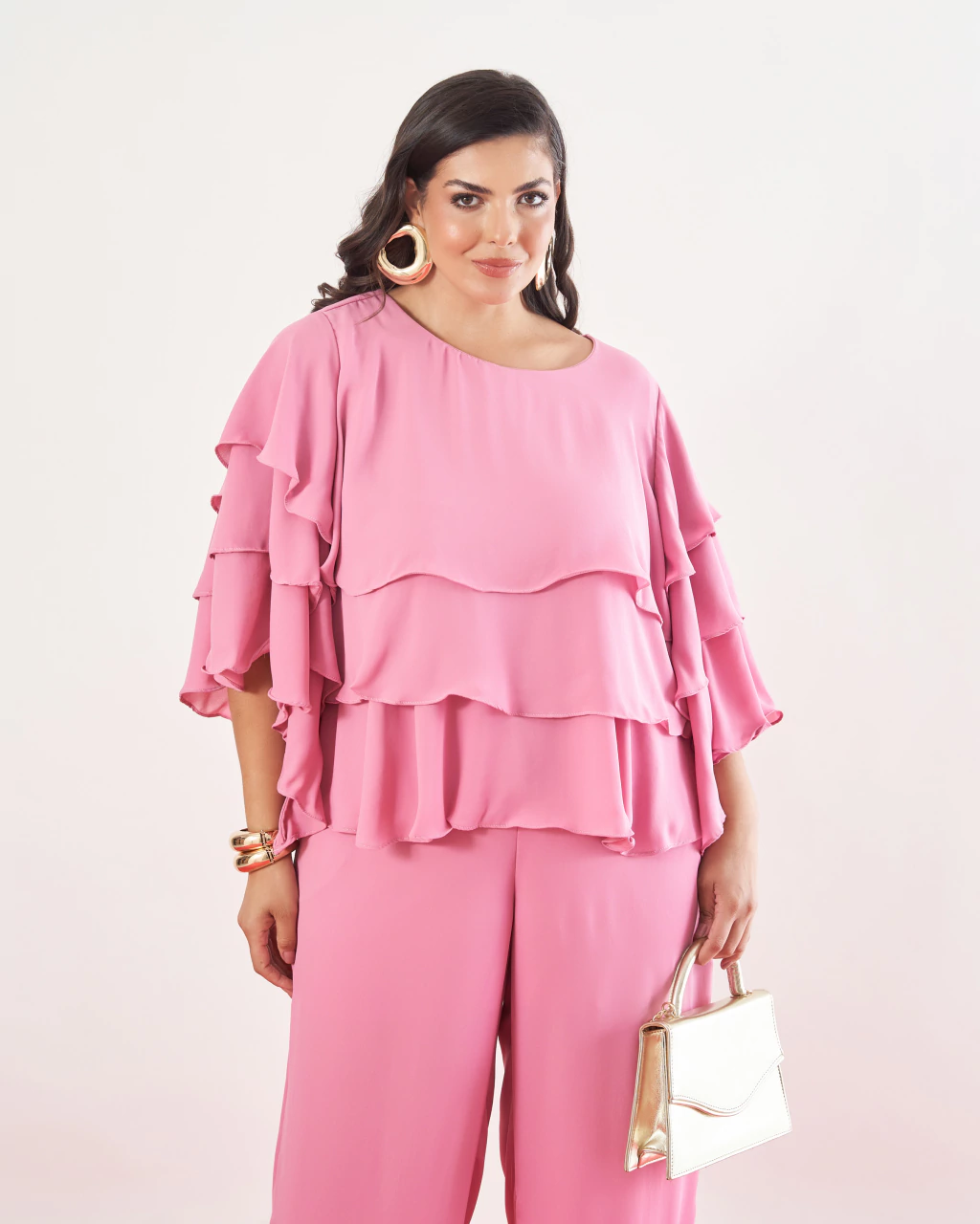 Blusa Ariele: uma peça que une elegância e conforto em cada detalhe. Confeccionada em 100% poliéster, seu tecido em crepe apresenta camadas delicadas que criam um visual sofisticado e moderno. As mangas ¾ embabadadas adicionam um toque feminino e charmoso, perfeito para diversas ocasiões.