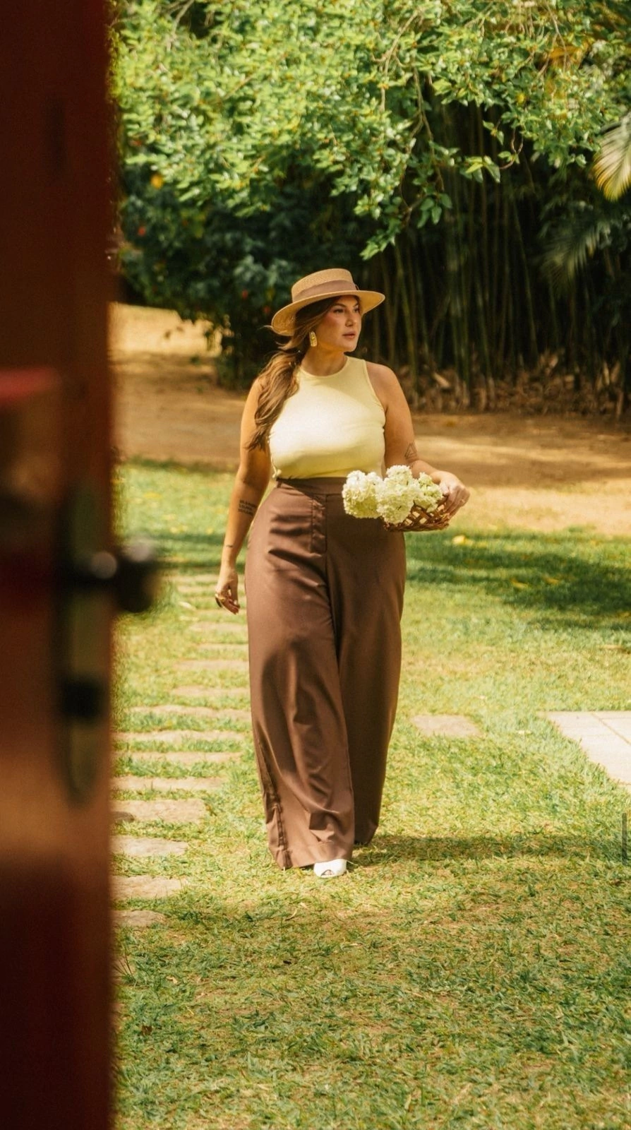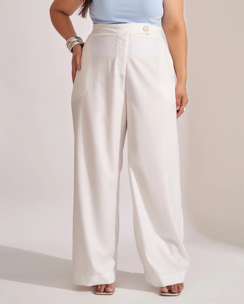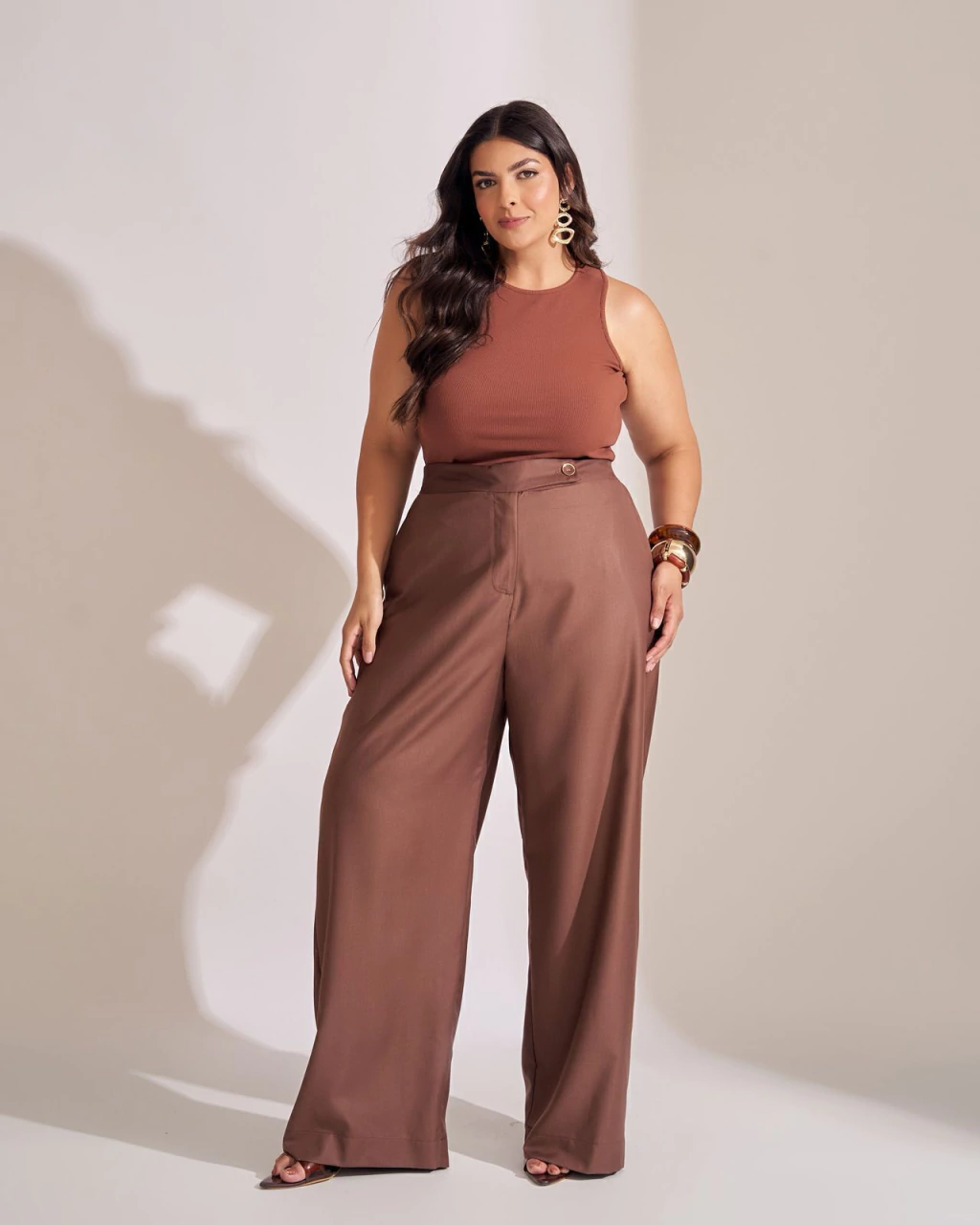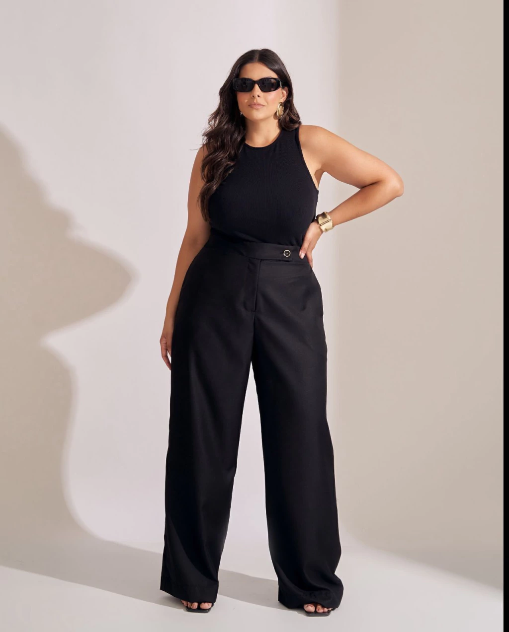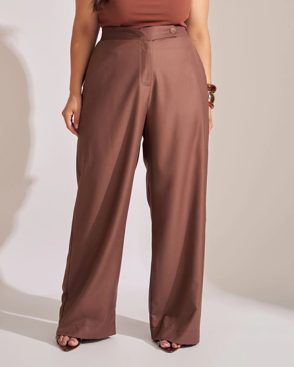 Calça Wide Leg Collab: conforto e estilo em uma peça única! Confeccionada em tecido com 88% poliéster e 12% viscose, oferece caimento sofisticado e toque macio. Destaca-se pelo cós deslocado com botão forrado dourado, além do elástico na parte de trás que garante ajuste perfeito. Conta também com bolso traseiro em alfaiataria. Disponível do tamanho 38 ao 54. Ideal para compor looks elegantes no dia a dia.