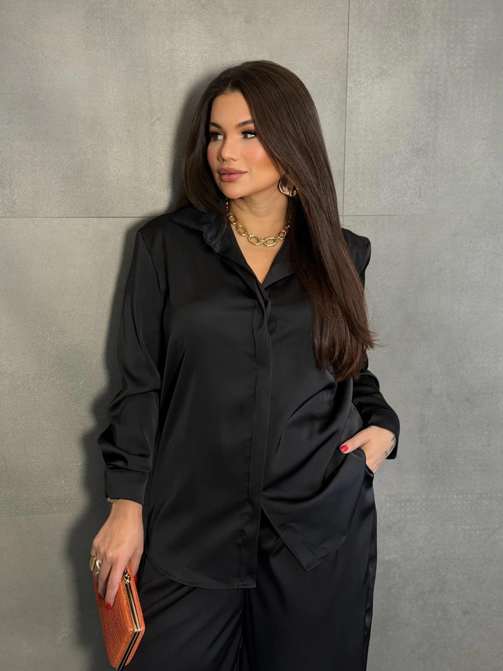 A Camisa Mabel é confeccionada em tecido 100% poliéster levemente acetinado, que garante toque macio e aparência sofisticada.