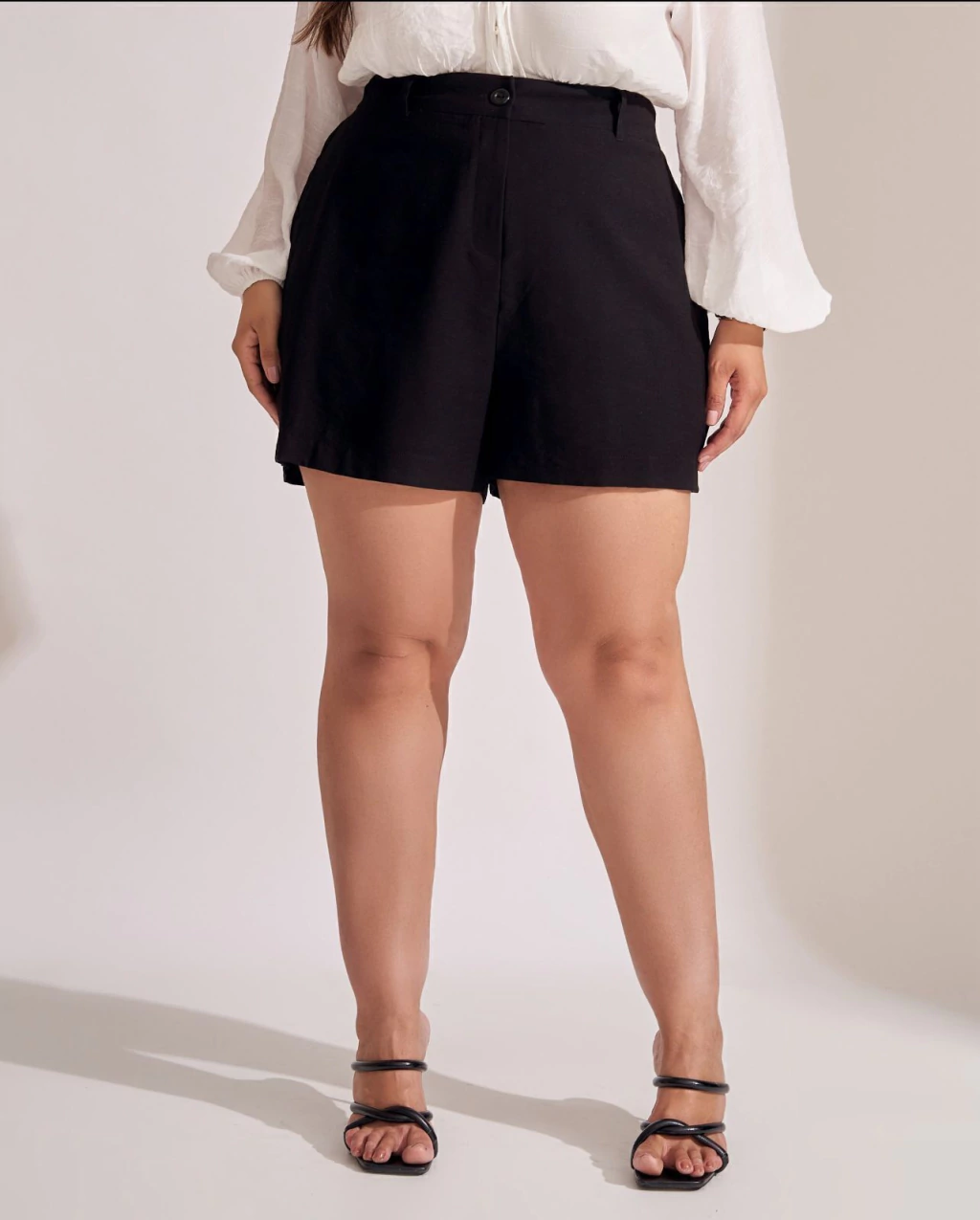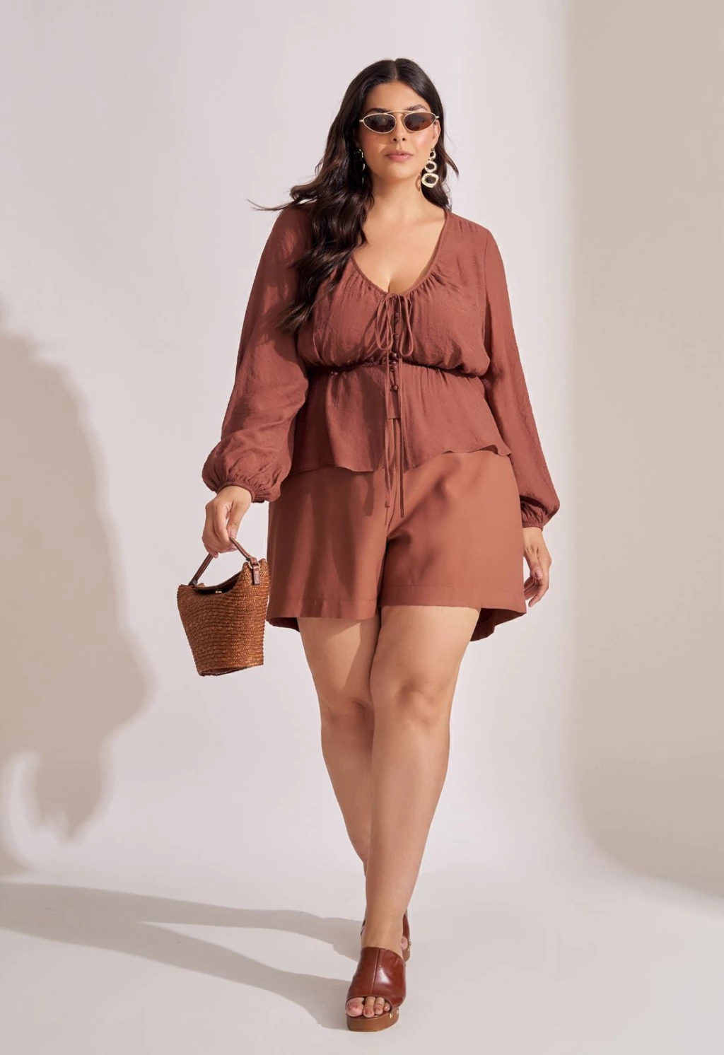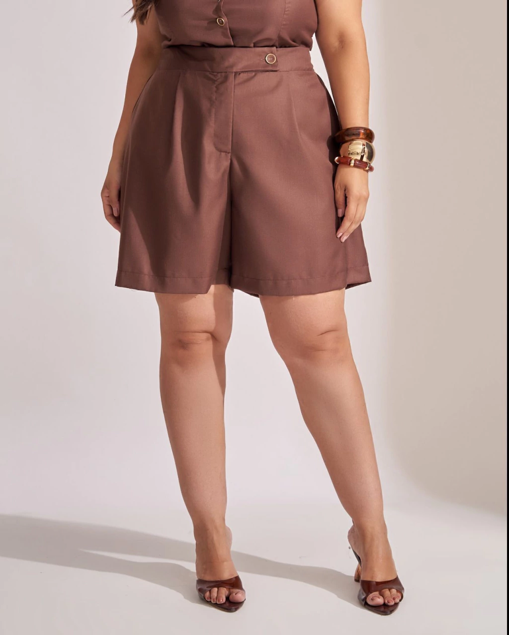 O Shorts Basic Collab é confeccionado em 90% viscose e 10% poliéster, garantindo conforto e leveza para o seu dia a dia. Apresenta cós liso na frente com botão tingido e elástico lateral na parte de trás, proporcionando ajuste perfeito. Conta com bolso invisível frontal e bolso traseiro, além de forro para maior comodidade. Disponível nos tamanhos 38 ao 54. Preço: R$ 269,99.