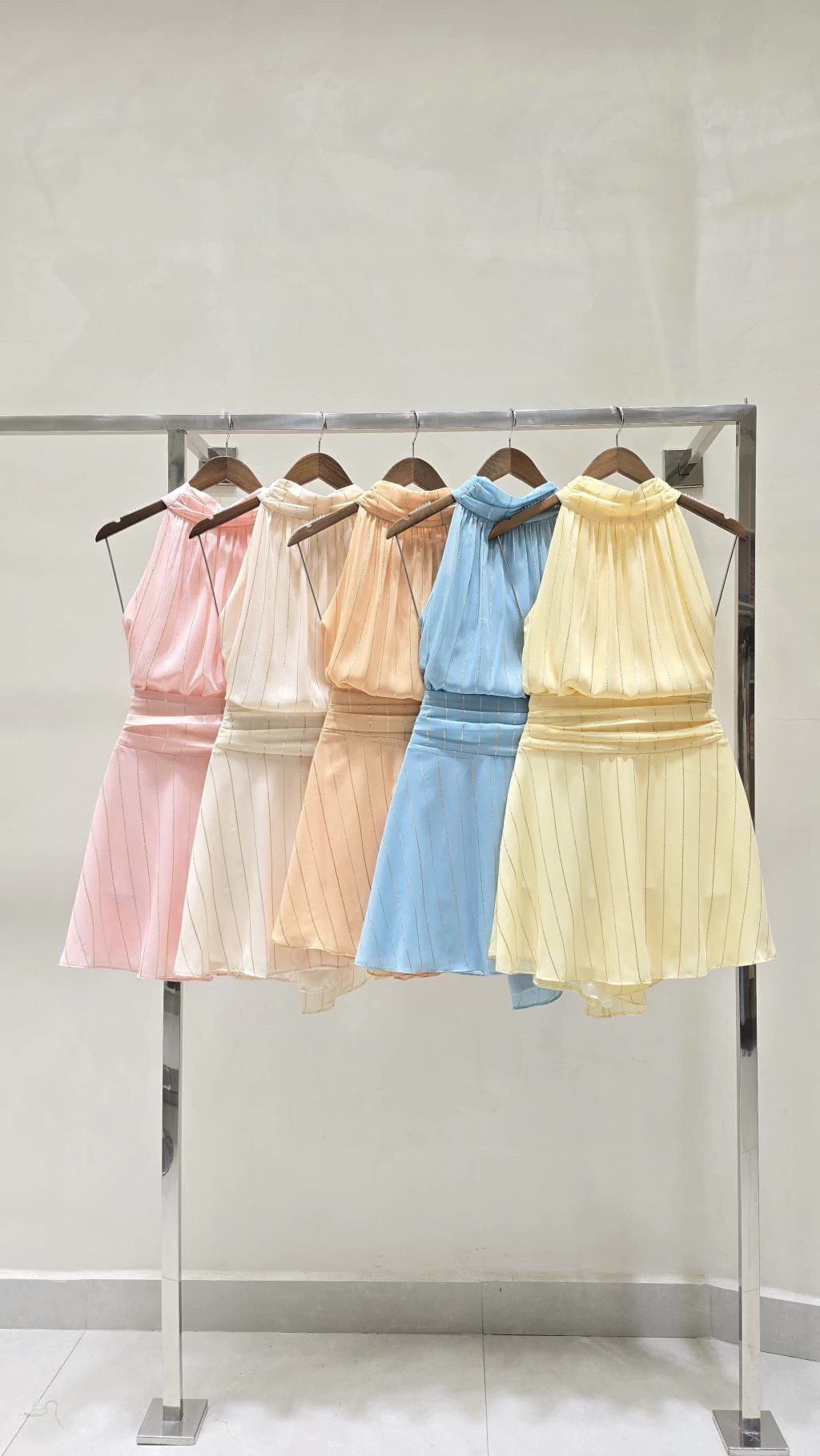 Vestido Kamila: charme e modernidade em um só look! Este vestido curto frente única com gola alta destaca-se pelo elástico na cintura que valoriza sua silhueta. Confeccionado em tecido fluido com listras e linhas, conta com fios de lurex que trazem brilho sutil, perfeito para as cores vibrantes do verão. Ideal para quem busca conforto e estilo em qualquer ocasião.